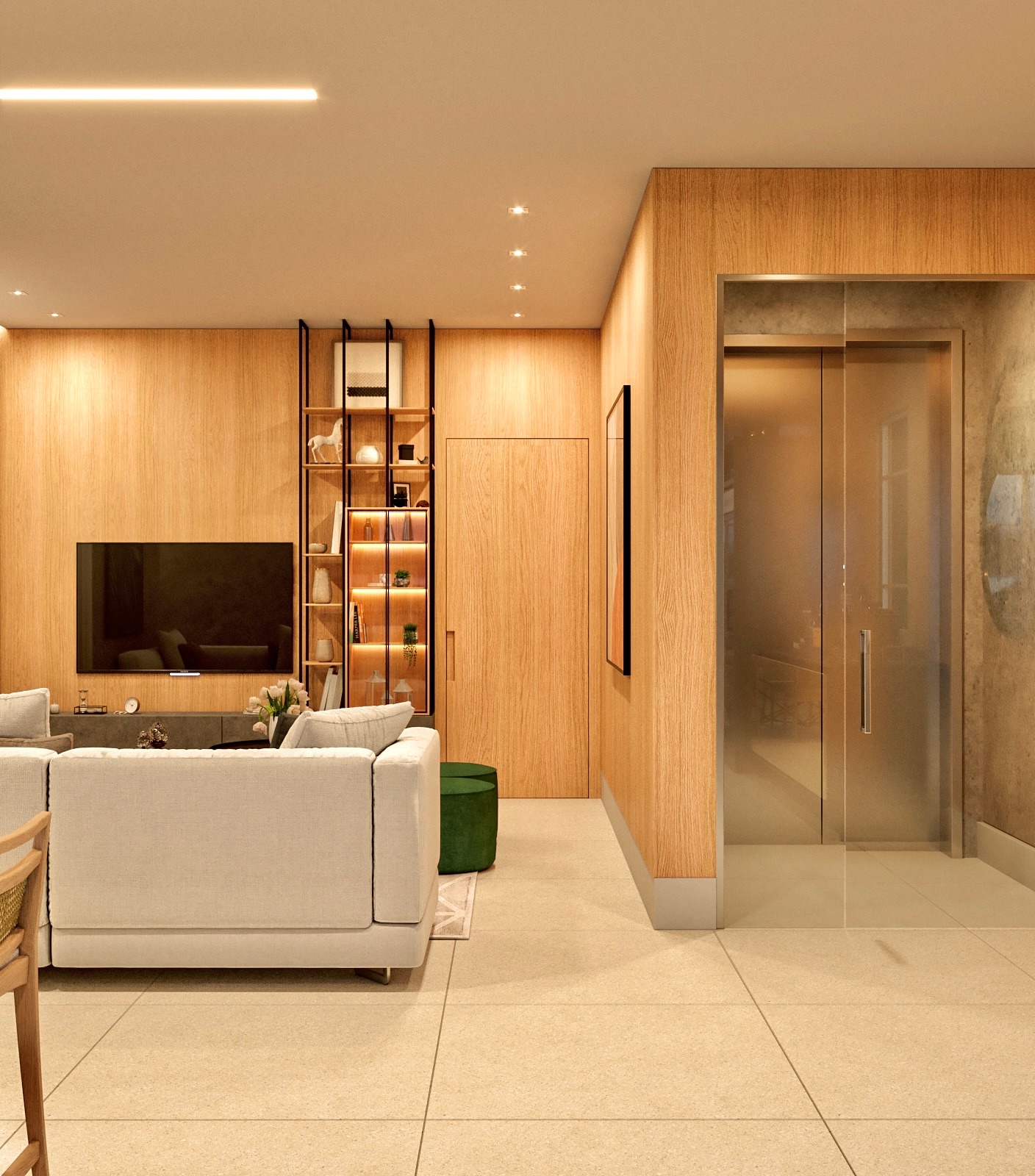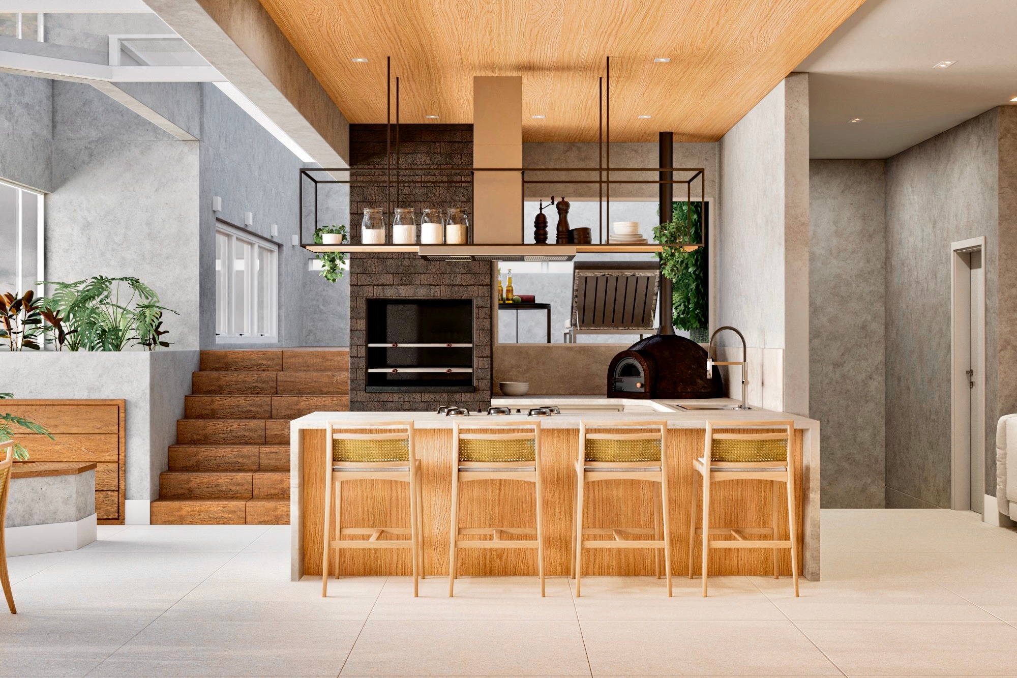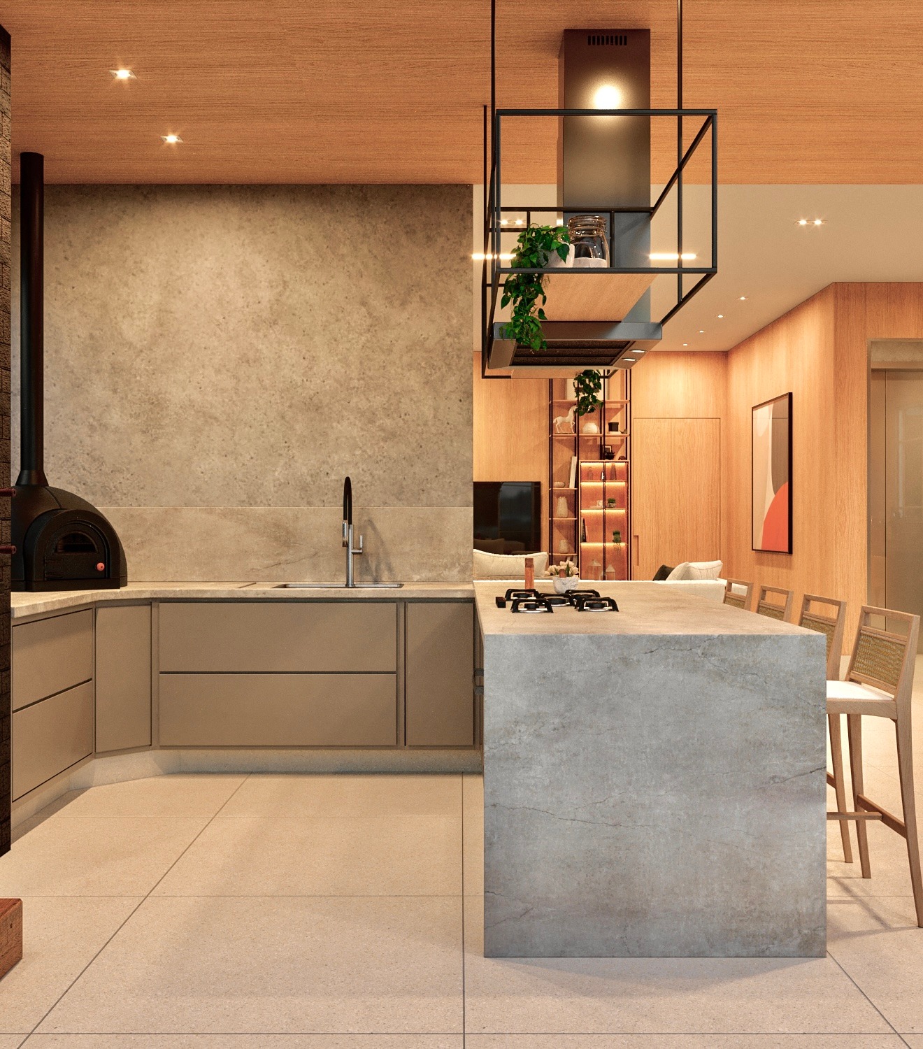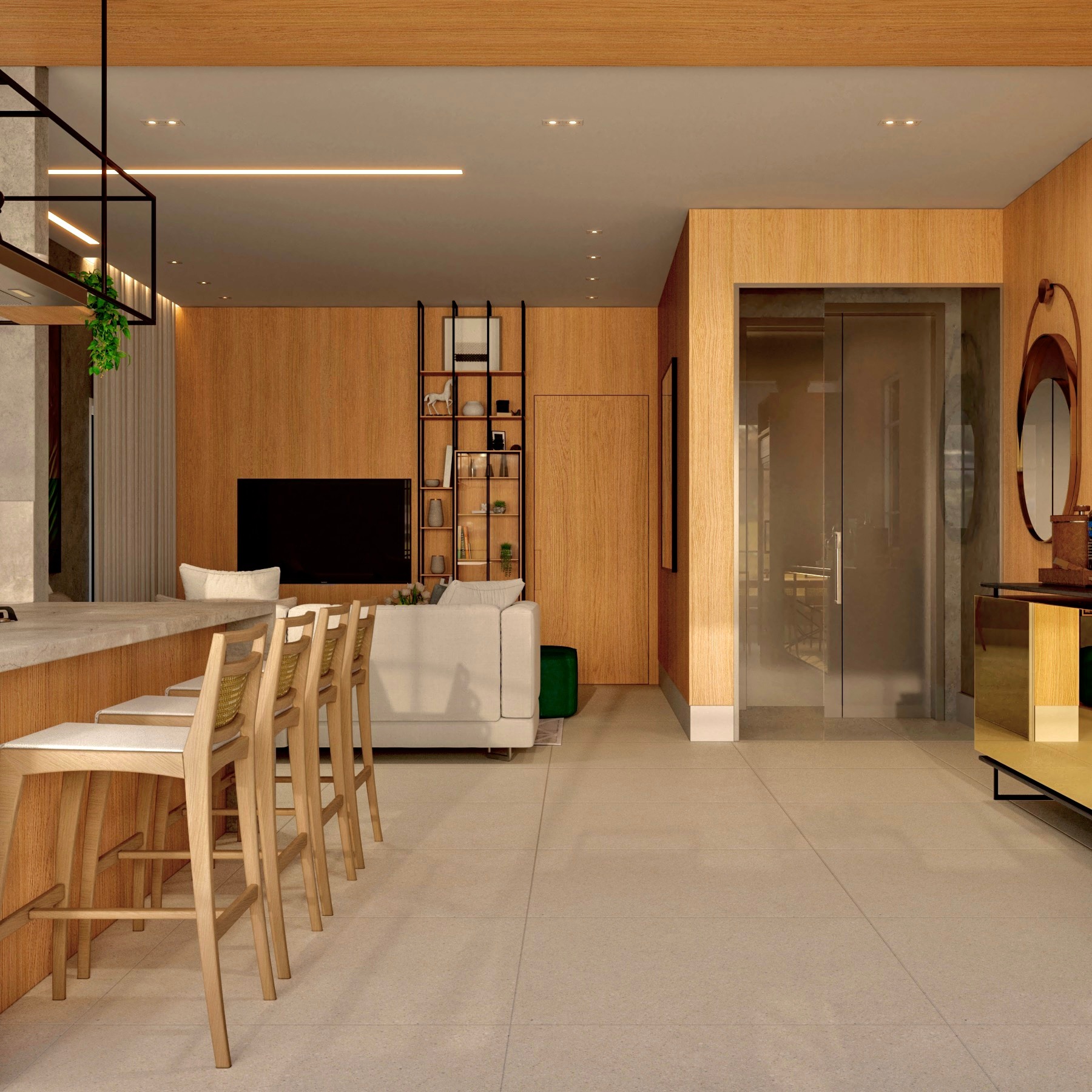 Apartamento moderno, utilizando bastante folha de madeira natural e elementos em concreto aparente.