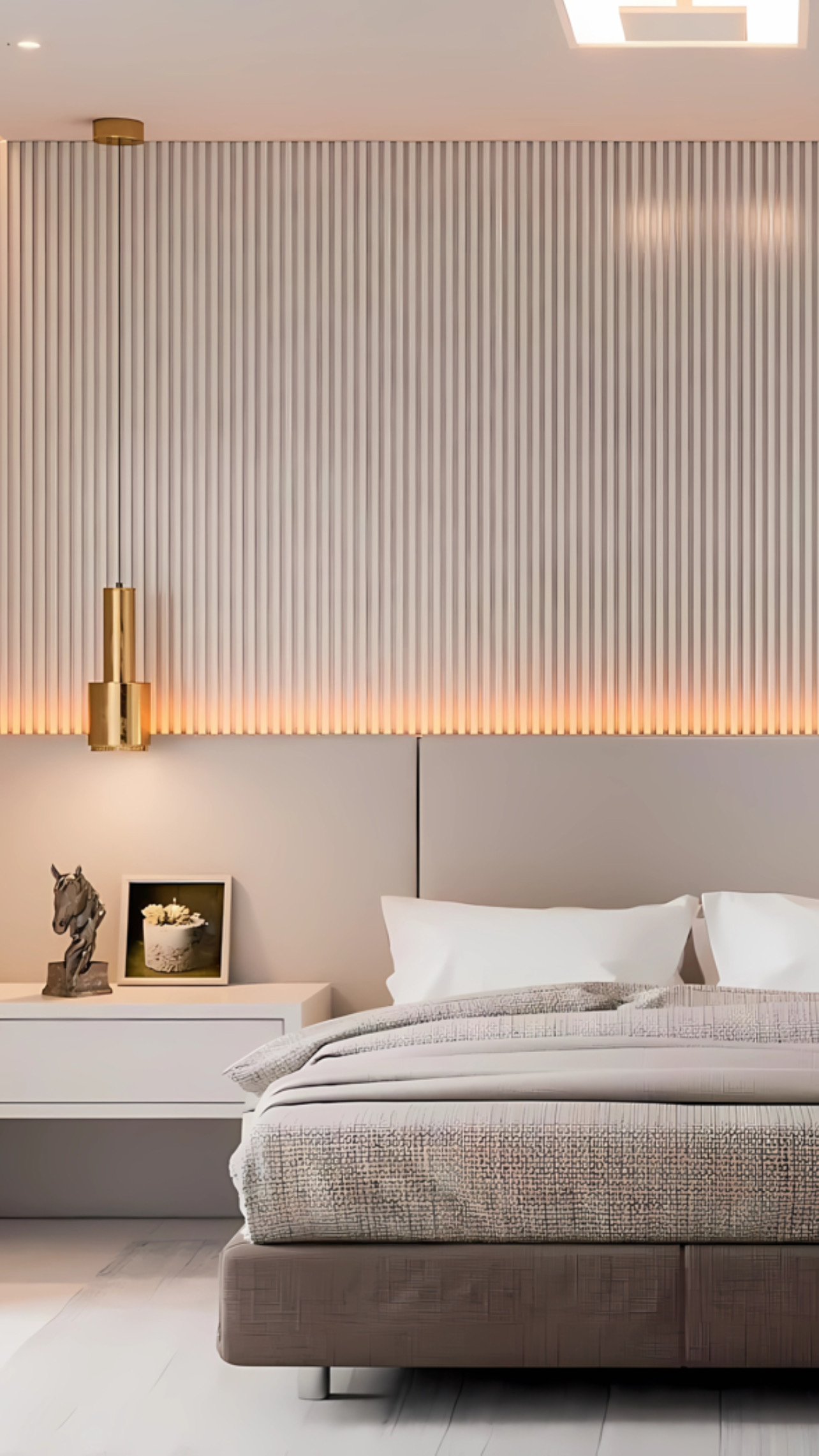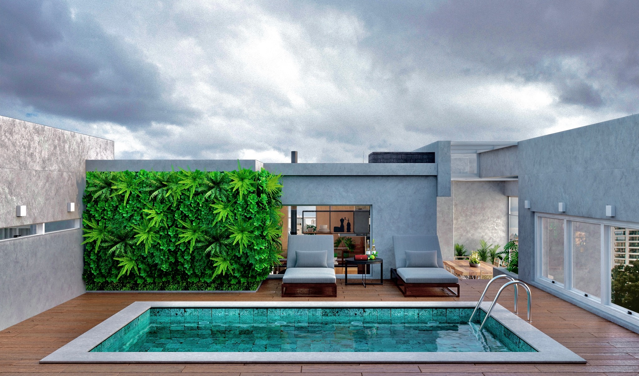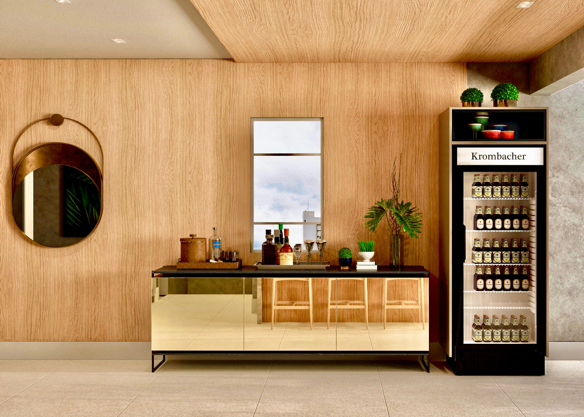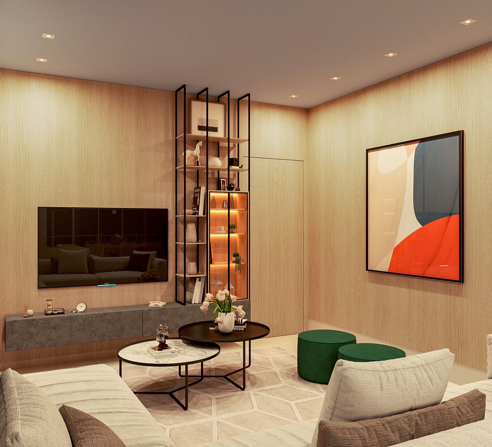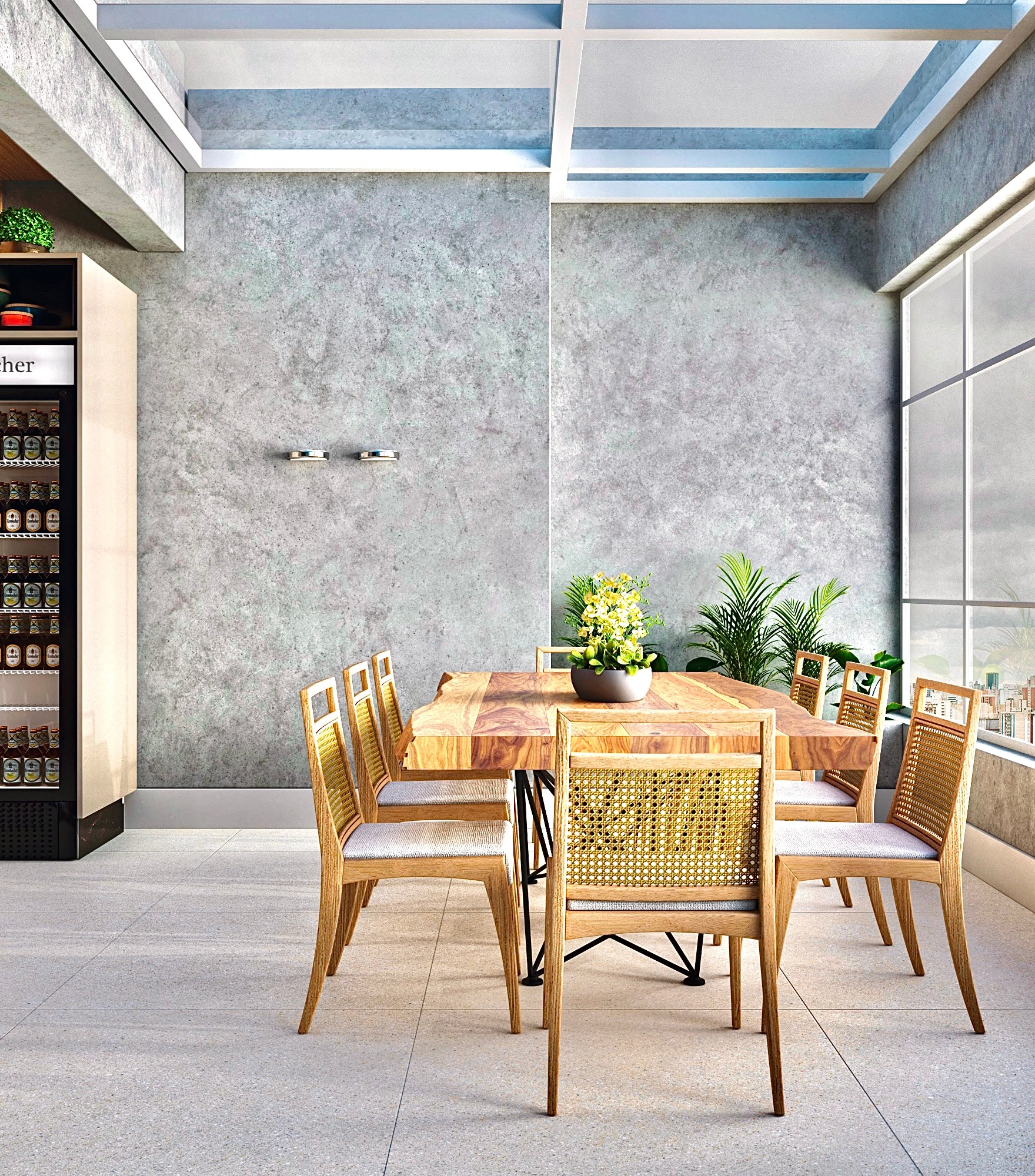 Apartamento moderno, utilizando bastante folha de madeira natural e elementos em concreto aparente.